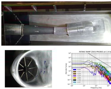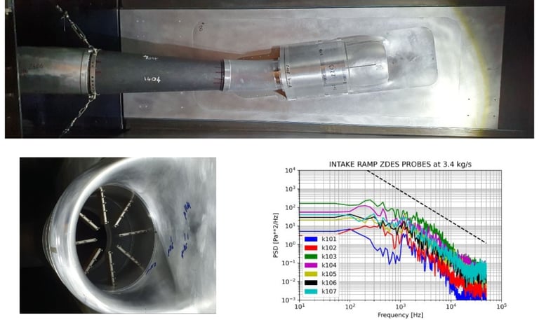 Se desarrolló una campaña en túnel de viento para una entrada de turbofán, con la implementación de sensores estacionarios y no estacionarios. El análisis de los datos permitió caracterizar las frecuencias de las señales y evaluar el comportamiento aerodinámico.